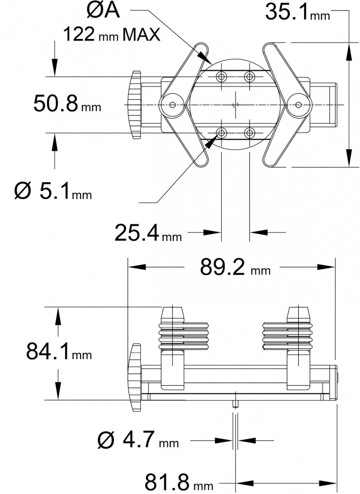 Een universele dop en flesgreep met een opspan ruimte van 5,1 tot 89 mm.