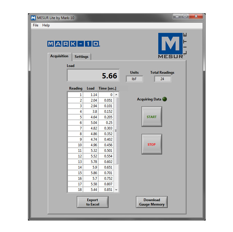 Deze testopstelling wordt geleverd met MESUR® Lite data-acquisitiesoftware. MESUR® Lite tabuleert continue of single point data. Exporteren met één klik naar Excel maakt verdere gegevensverwerking mogelijk. Een uitgebreide versie van dit programma, MESUR®gauge of MESUR®gauge+ is als optie verkrijgbaar.