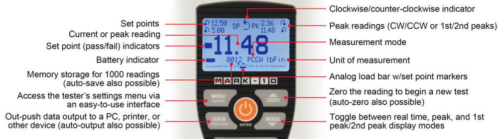 De TT01 is voorzien van USB-, RS-232-, Mitutoyo- en analoge uitgangen, en is voorzien van automatische gegevensuitvoer en nulstelling bij het verwijderen van de dop. Verder heeft dit apparaat een geheugenopslag voor 1.000 metingen, pass/fail-indicatoren en meer. Eerste / tweede piekkoppeldetectie is handig voor het meten van slip- en losbreekkoppels voor verzegelde sluitingen.