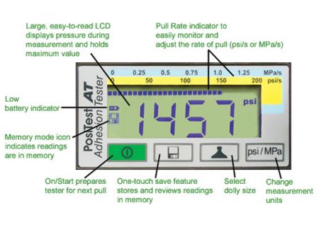 De PosiTest hydraulische adhesietester voor coating-sterkte en verfhechting tester kan bepalen met welke kracht een coating of verflaag hecht op zijn ondergrond. Deze destructieve adhesie-testmethode werkt door middel van het verlijmen van een zogenaamde dolly op de coating, deze wordt vervolgens verticaal van de ondergrond getrokken met behulp van de hydraulische pomp.