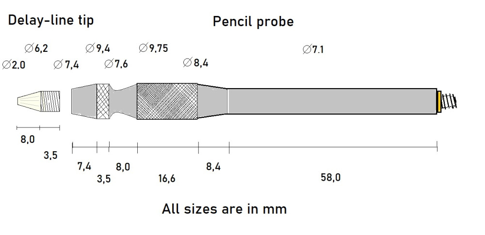 De delay-lijn potloodprobe is ontworpen met een compacte vormfactor voor nauwkeurige ultrasone metingen in kleine ruimten. Het standaardmodel heeft een robuuste behuizing met verwisselbare delay-lijn tips in meerdere diameters, zodat hij geschikt is voor verschillende materialen en inspectie-eisen.